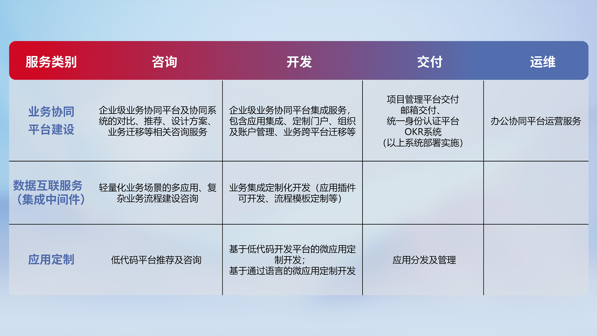 针对钉钉、、、企微、、、、IDaas等平台级产品提供产品的规划、、、、方案、、交付、、定制化开发等服务,,,,实现如统一协同办公、、、、智能客户服务、、、、混合会议管理、、、智能数据查询、、、等业务场景,,,实现数字化转型。。。。