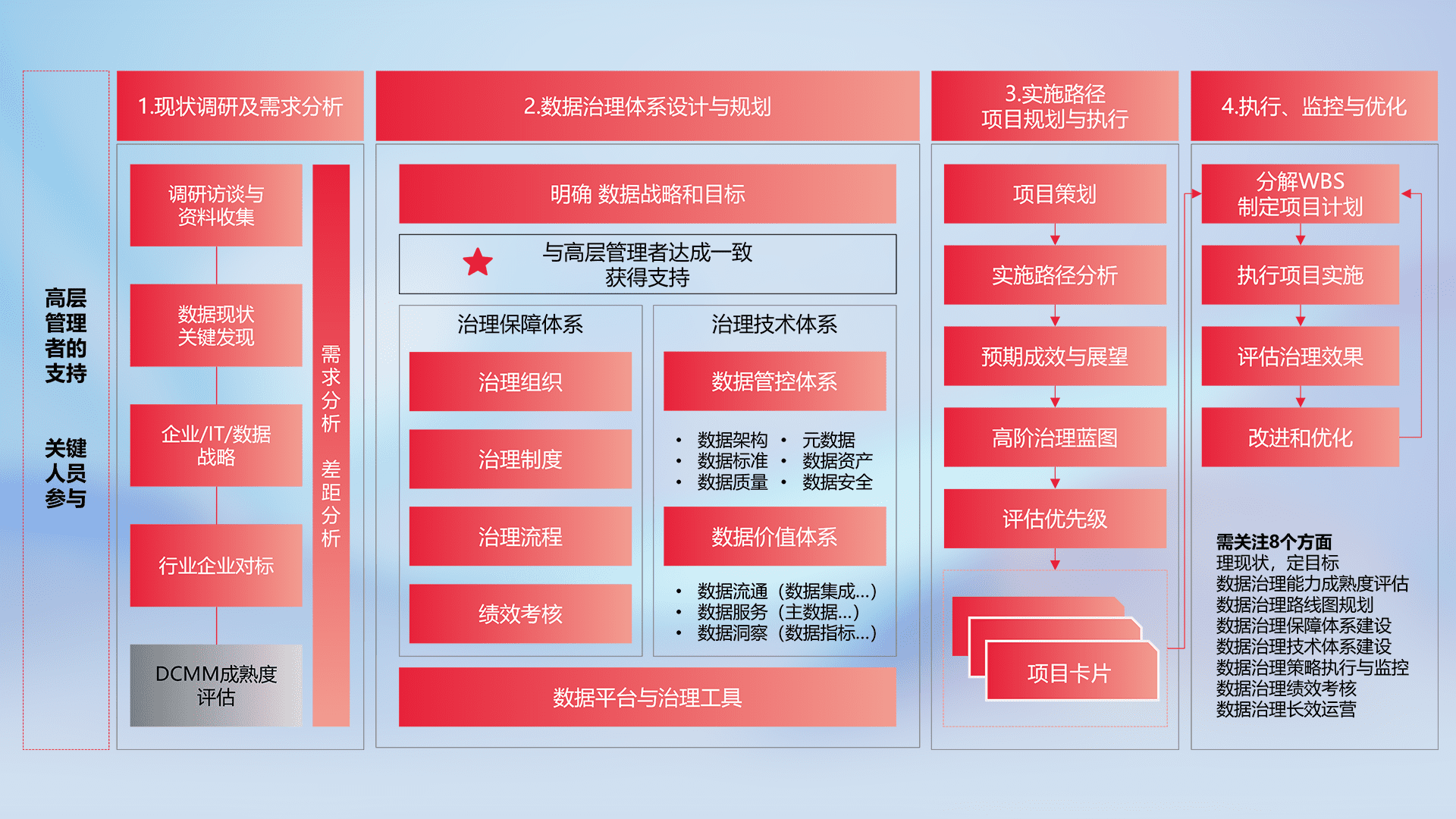 制定并执行统一的数据标准,,规范数据定义和格式,,消除冗余和不一致性,,,,实现跨部门和跨系统的数据一致性,,,,为企业提供标准化的数据基础。。